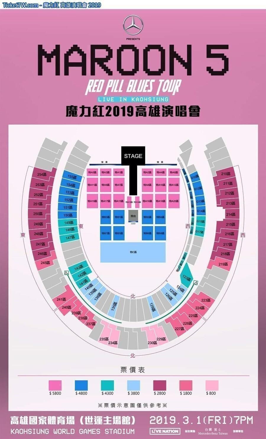 門票價錢: NT 5800 / 4800 / 4300 / 3800 / 2800 / 1800 / 800。