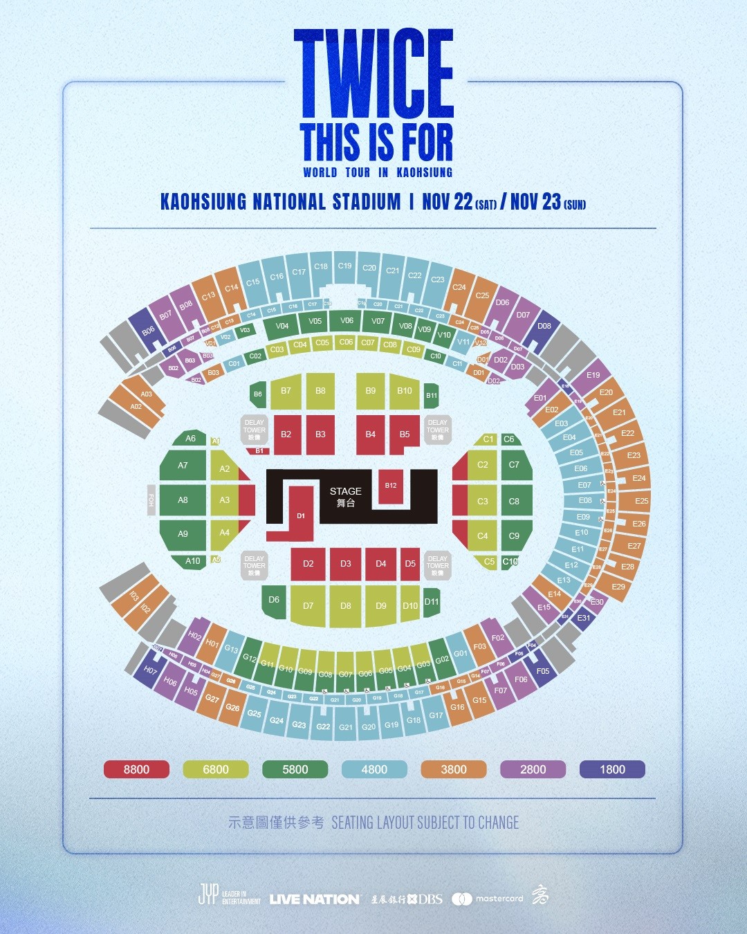 門票價錢: NT 8800 / 6800 / 5800 / 4800 / 3800 / 2800 / 1800。
