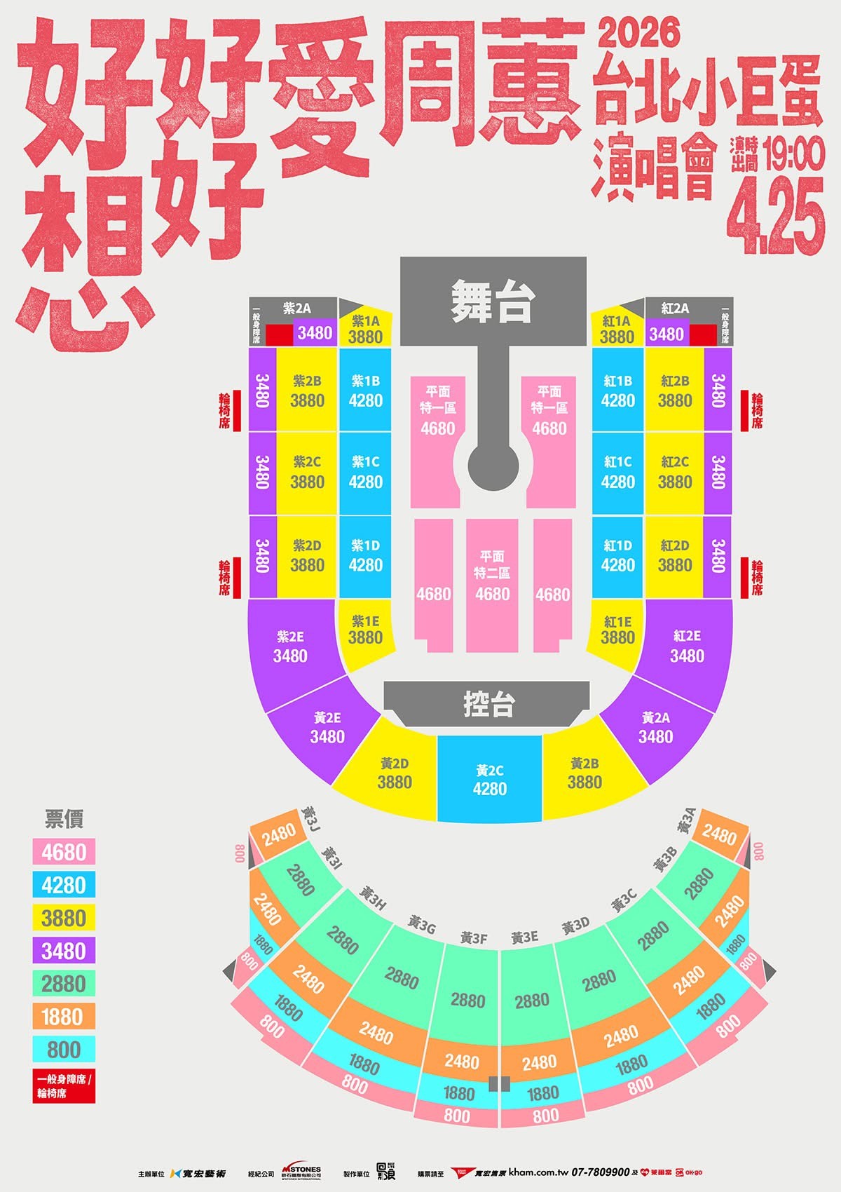 門票價錢: NT 4680 / 4280 / 3880 / 3480 / 2880 / 2480 / 1880 / 800。